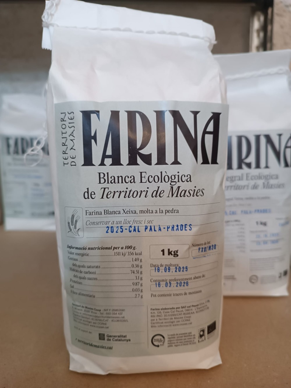 La farina ecològica de Territori de Masies existeix gràcies a la inquietud de sòcies agràries que cultiven cereal ecològic per lluitar contra el contrasentit que a un país tan cerealícola com el del baix Solsonès i rodalia el cereal que es conrea sigui gairebé inexistent a cuines i fleques. Sorgeix també per enfortir la petita pagesia compromesa, aquella que amb els peus al tros i el cor a la mà, treballa perquè als pobles del baix Solsonès i rodalia es pugui viure de la terra i s'hi pugui viure. Les farines ecològiques són elaborades amb blats fets en camps i feixes de les sòcies agràries del baix Solsonès i rodalia, a dia d'avui, pel pagès Arnau Vilaseca de cal Palà de prades, la pagesa Pilar Clotet del Molí de Bonsfills de Vallmanya, el Joan Moncunill de Moncunill d'Ardèvol i la Dolors Mas, de cal Piquet de Vallferosa.