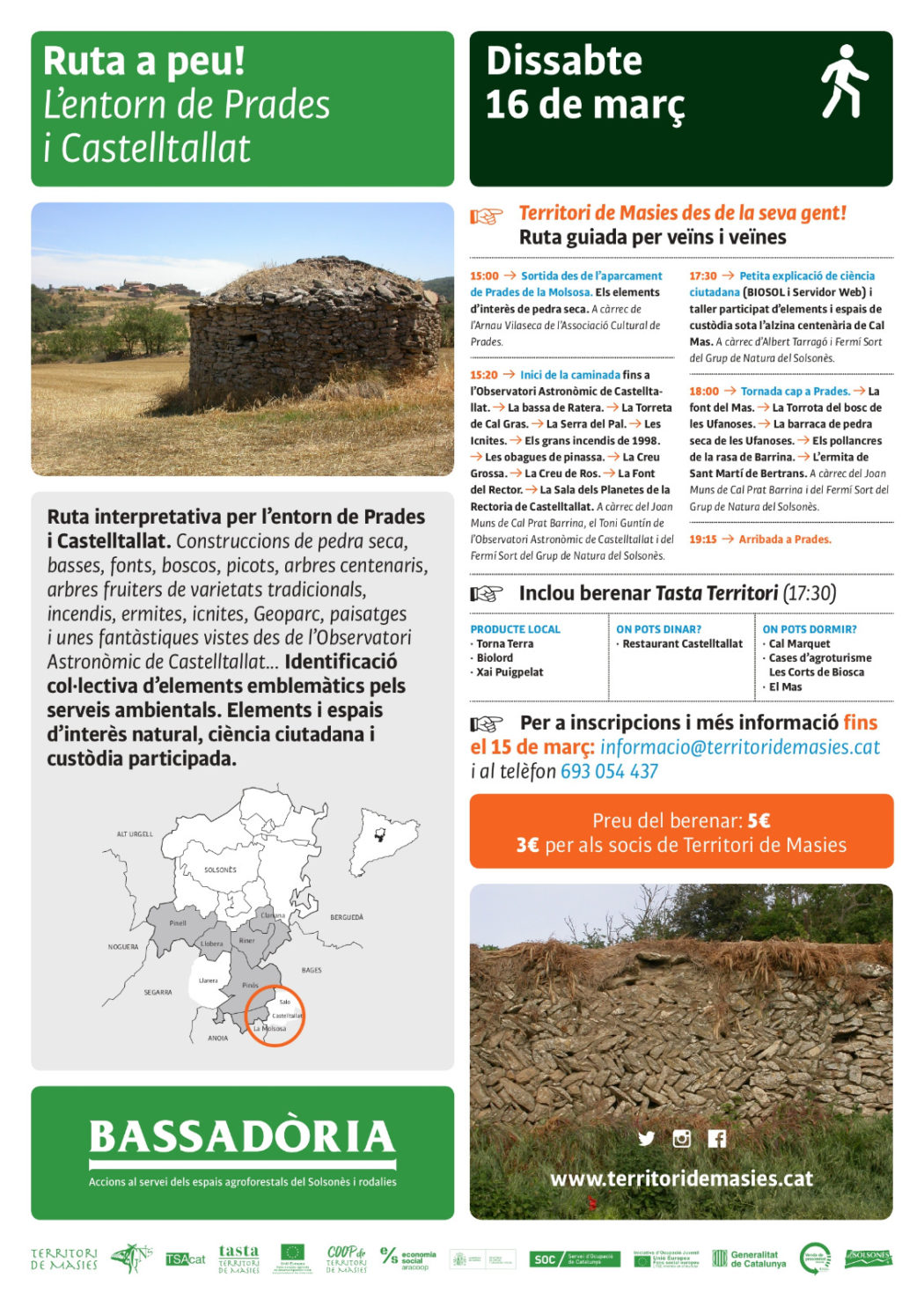En el marc del Projecte BASSADÒRIA que estan duent a terme Territori de Masies i el Grup de Natura del Solsonès (GNS) es farà una sortida pels voltants de Prades i Castelltallat per descobrir alguns dels seus elements patrimonials més destacables. Es podran veure construccions de pedra seca, basses, fonts, boscos, picots, arbres centenaris, arbres fruiters de varietats tradicionals, incendis, ermites, icnites, Geoparc, paisatges i unes fantàstiques vistes des de l’Observatori Astronòmic de Castelltallat.